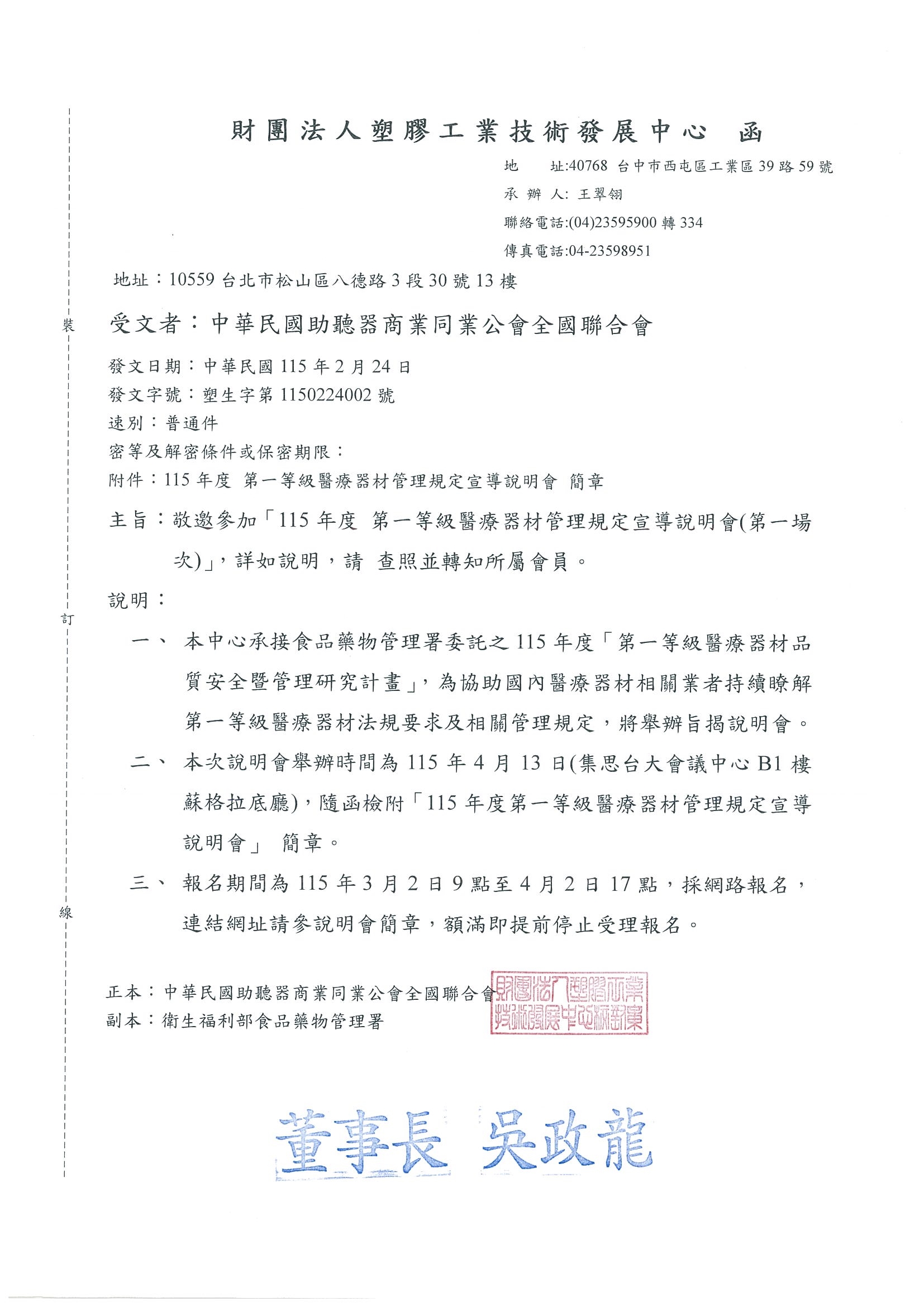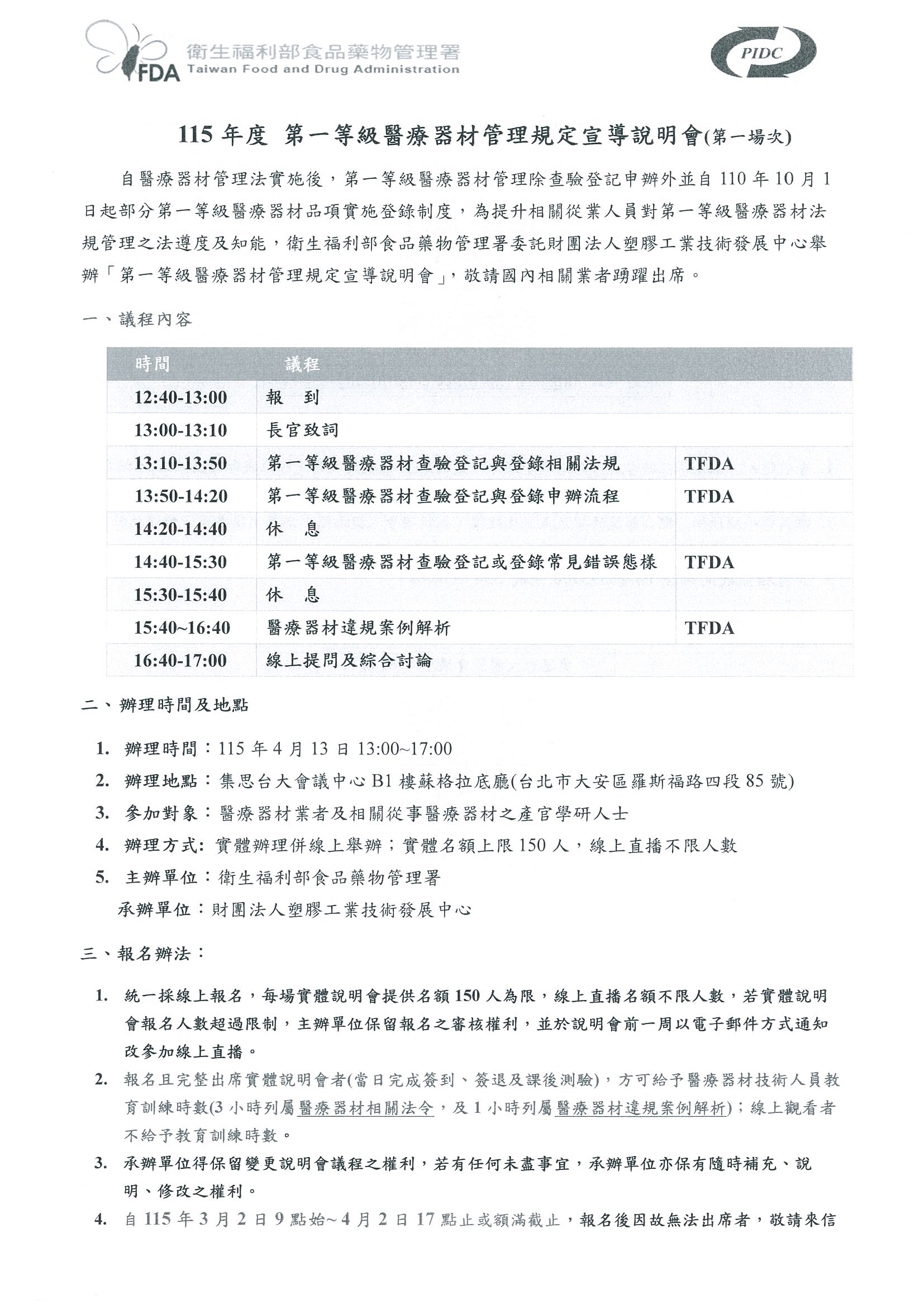 【塑工技展中心】敬邀參加「115年度第一等級醫療器材管理規定宣導說明會」
