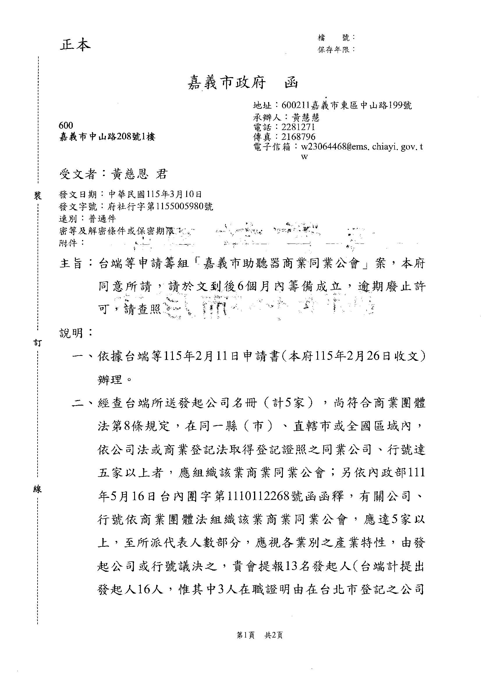 【嘉義市政府】同意申請「嘉義市助聽器商業同業公會」