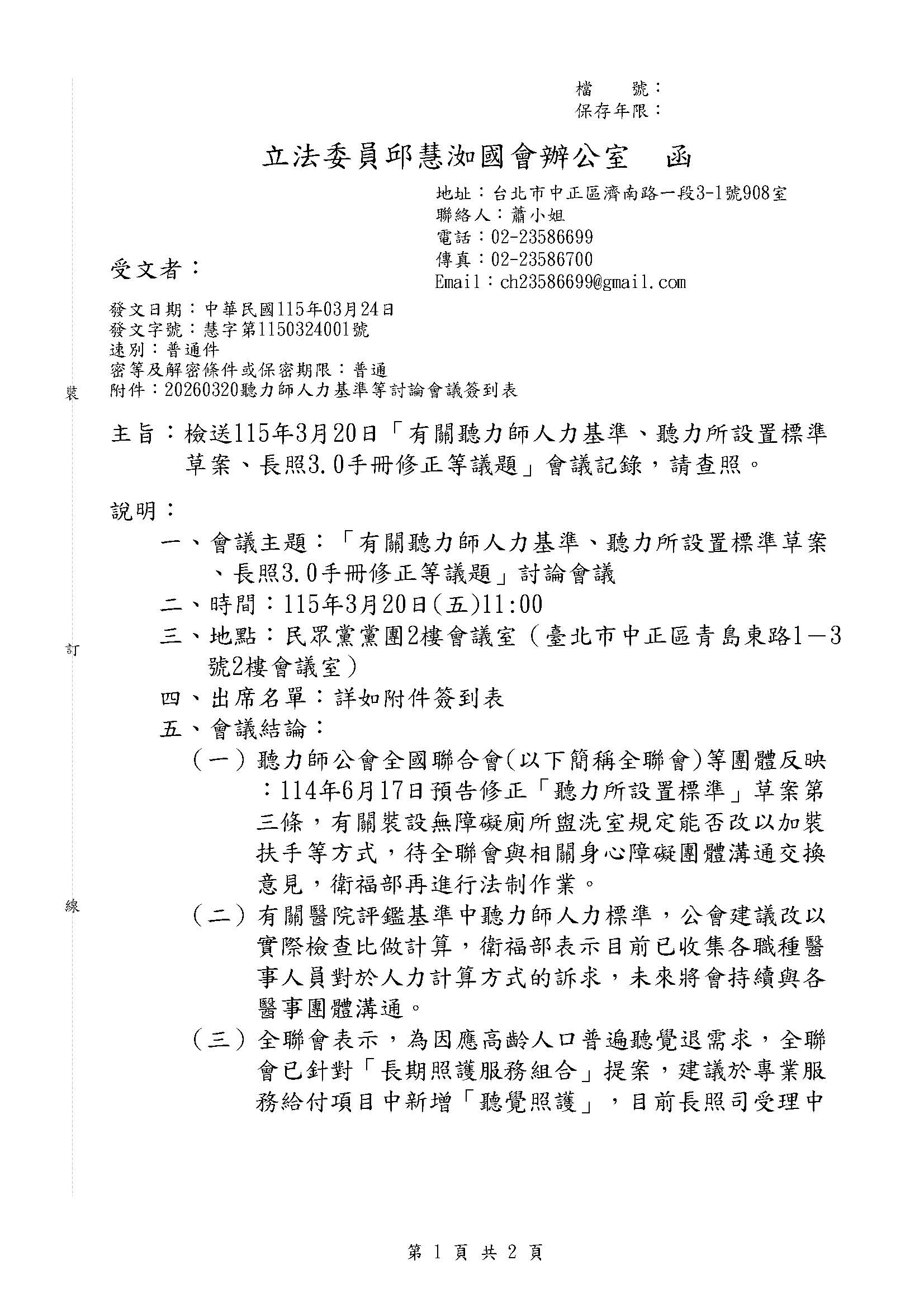 【助聽器全聯會】檢送「有關聽力師人力基準、聽力所設置標準草案、長照3.0手冊修正等議題」