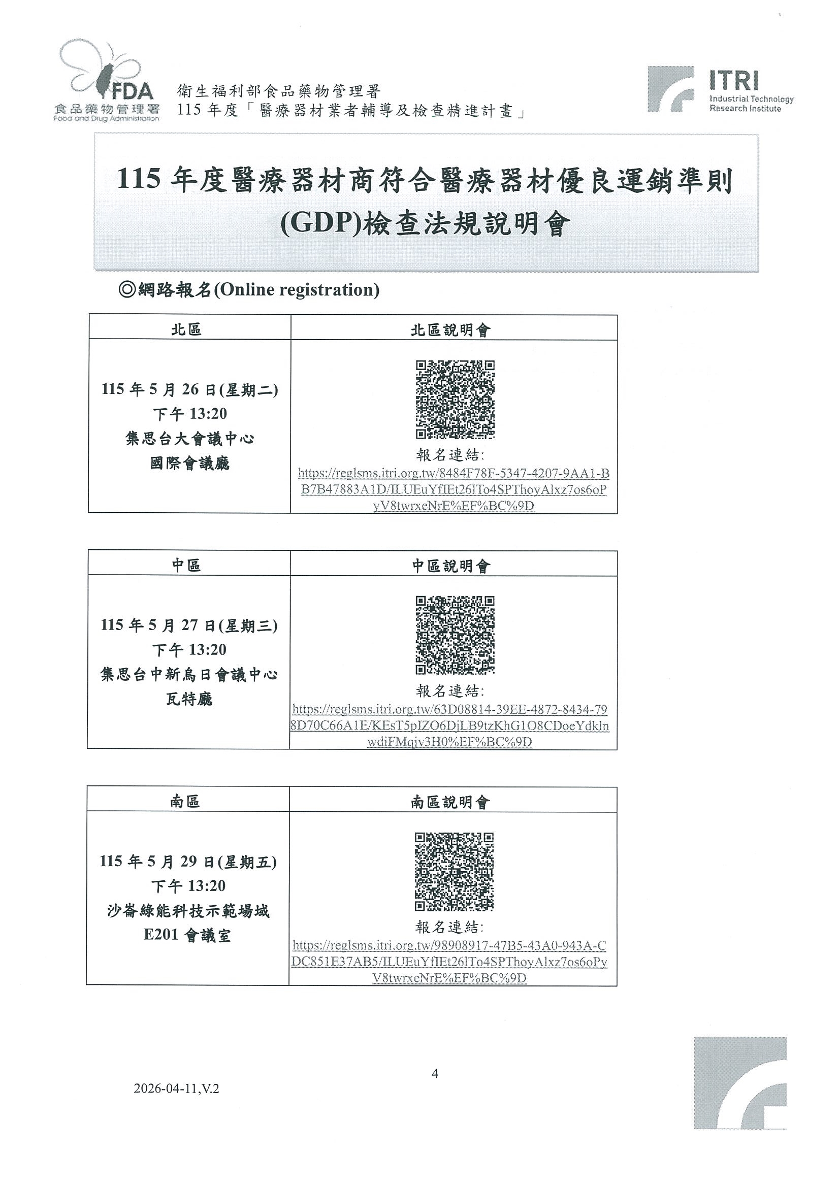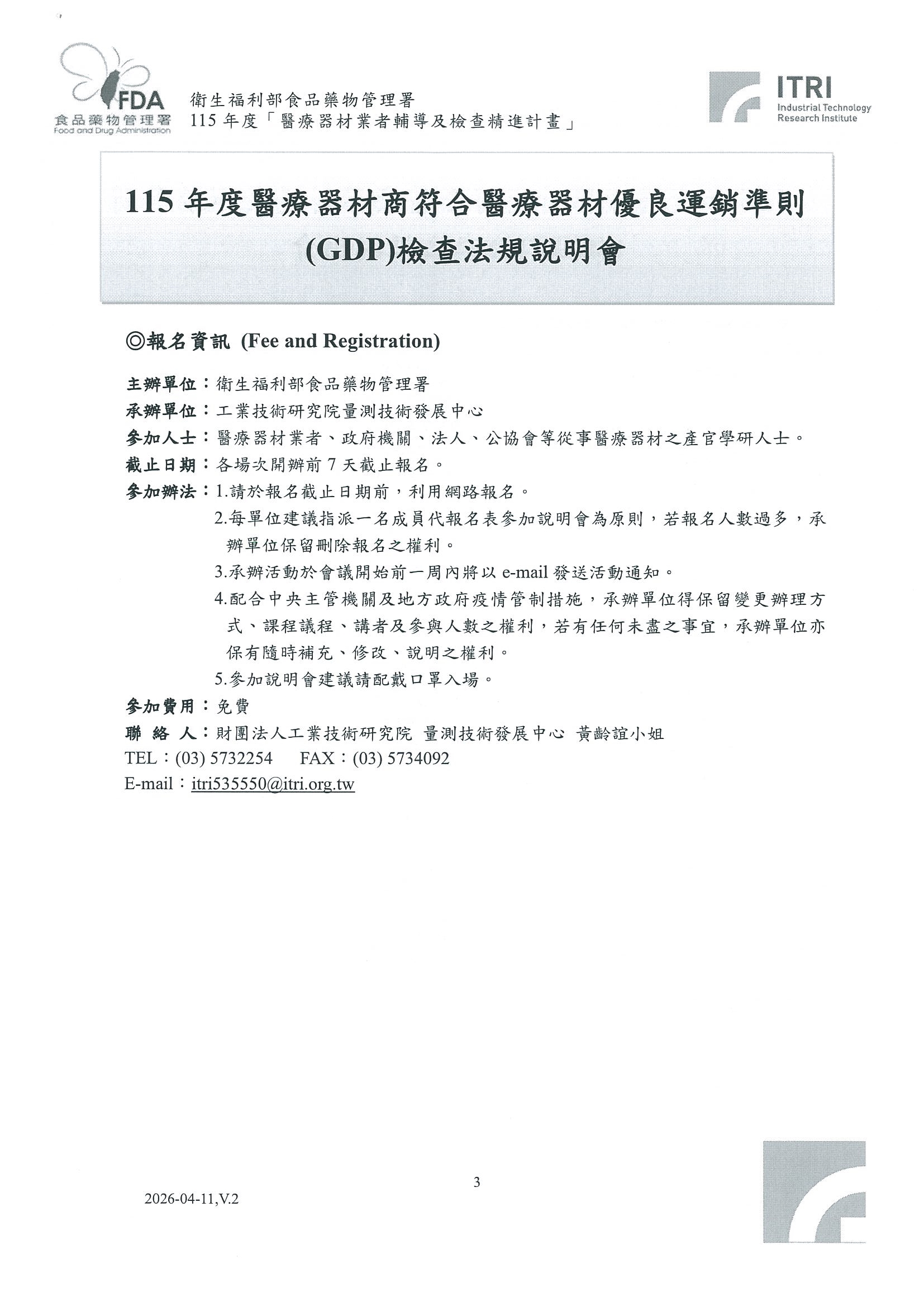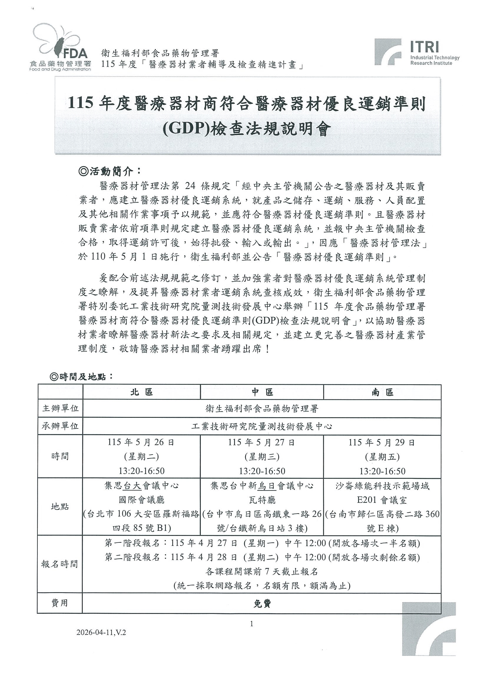 【工研院】敬邀參加「115年度醫療器材符合醫療器材優良運銷準則(GDP)檢查法規說明會」