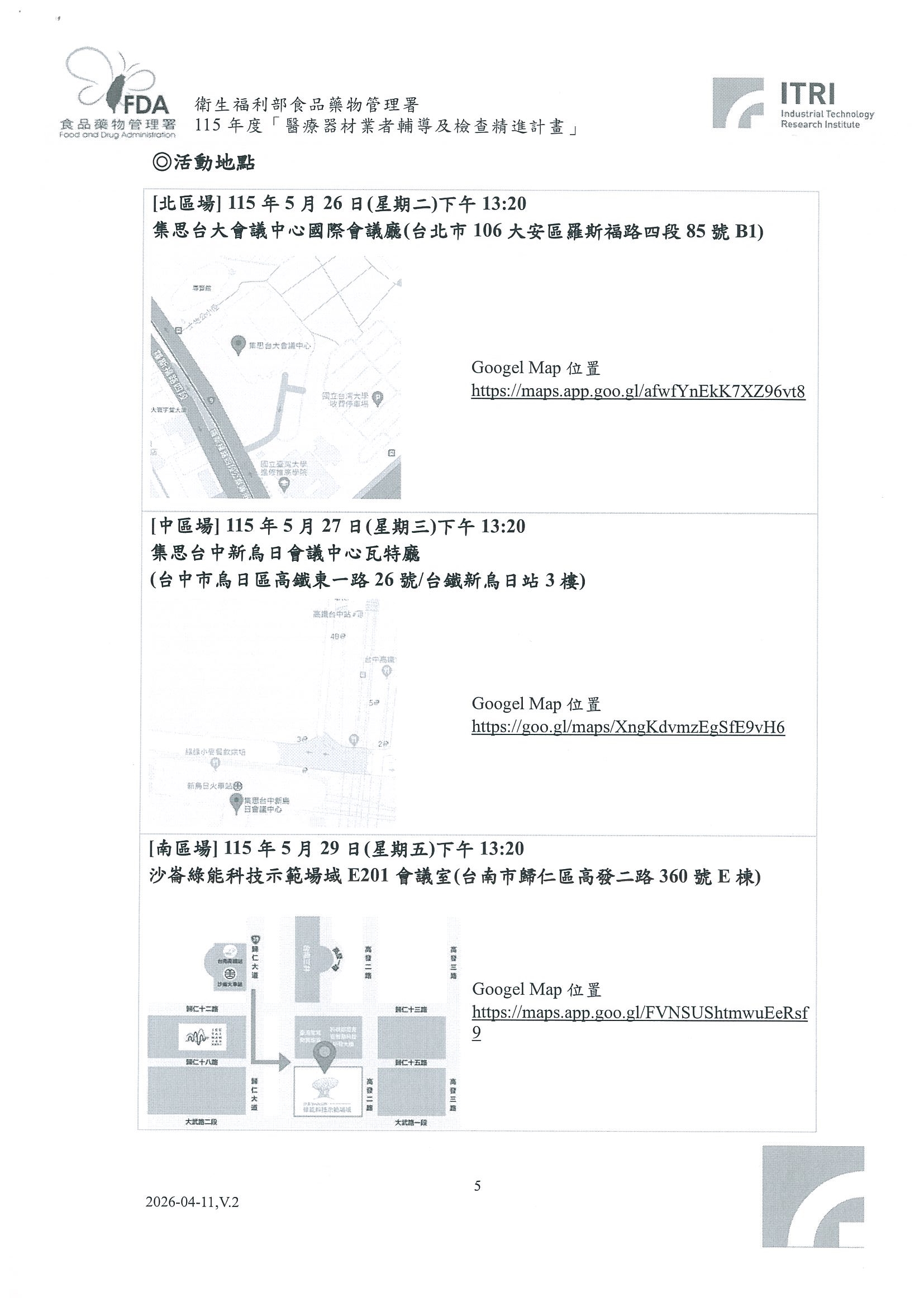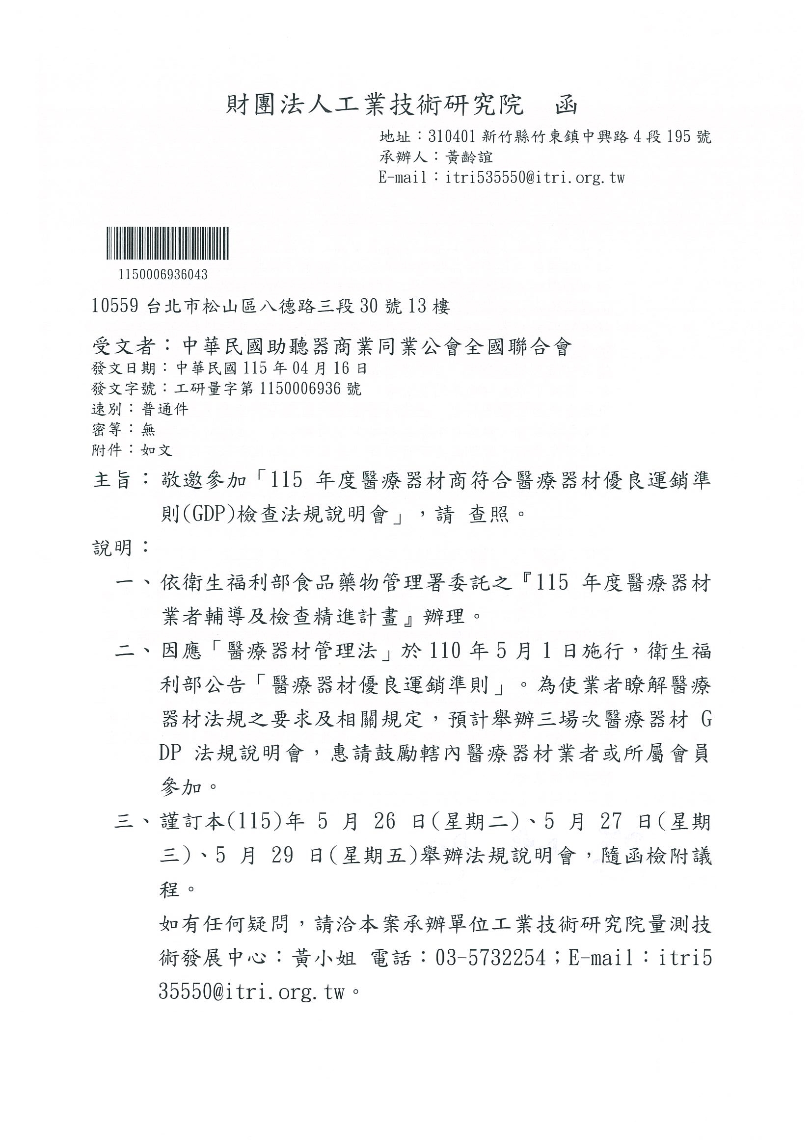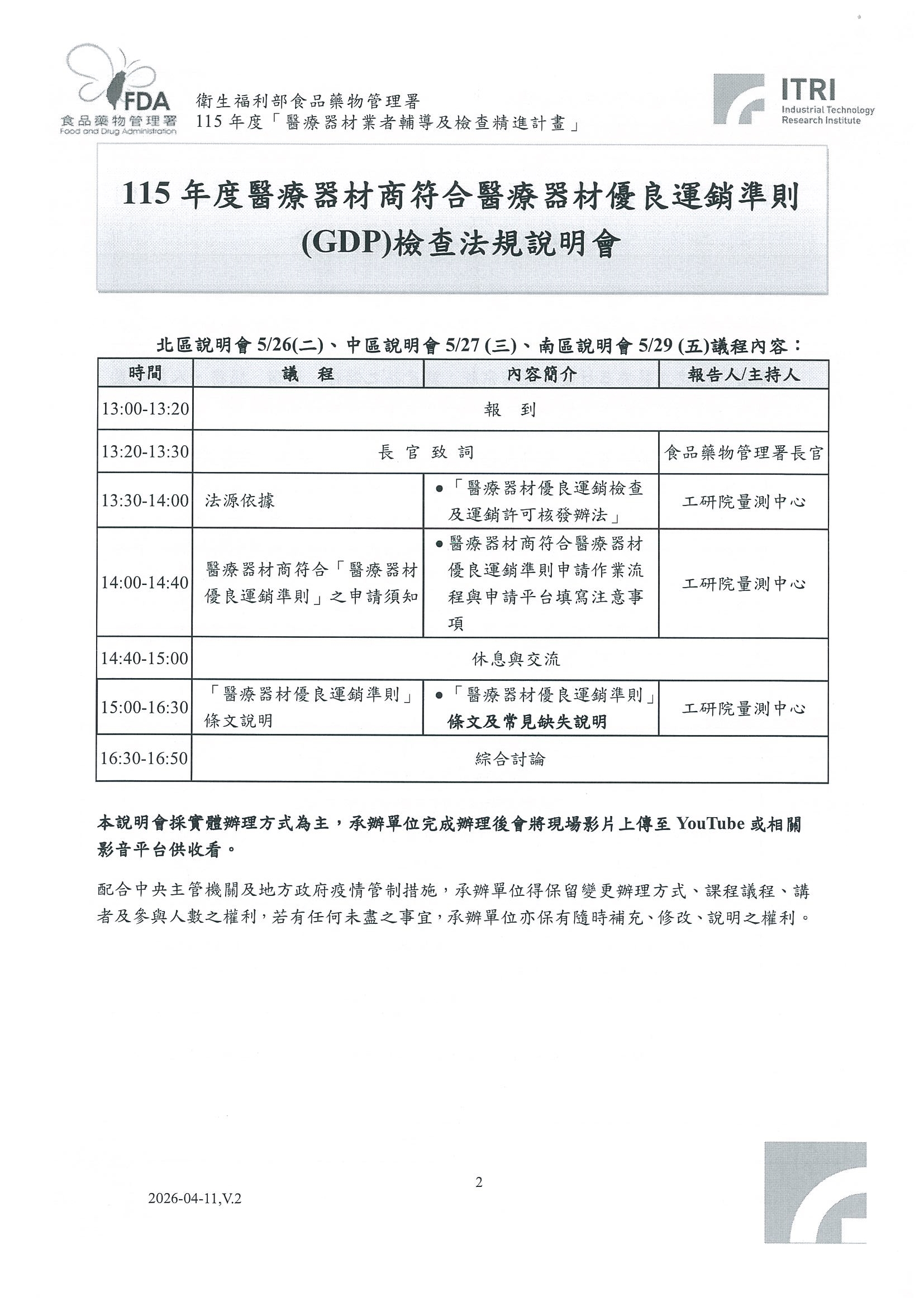 【工研院】敬邀參加「115年度醫療器材符合醫療器材優良運銷準則(GDP)檢查法規說明會」
