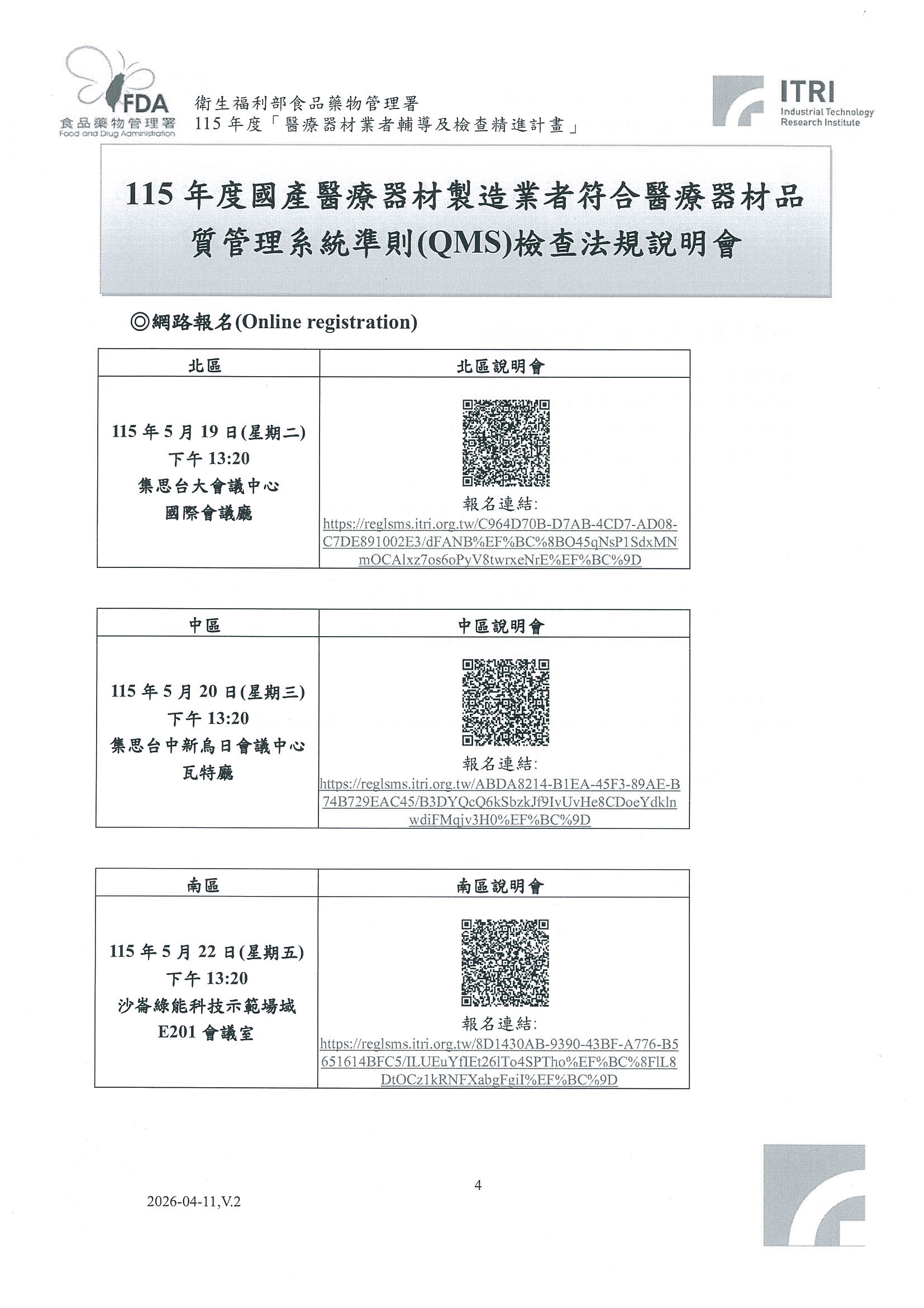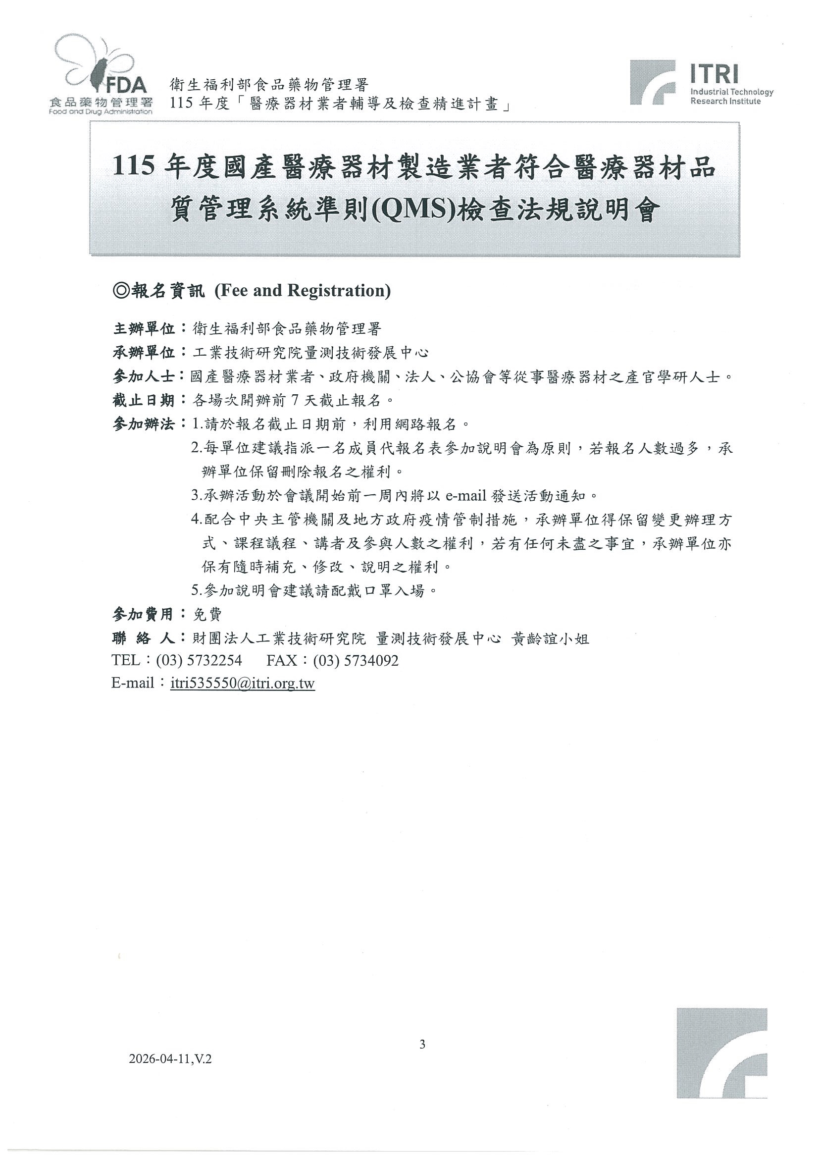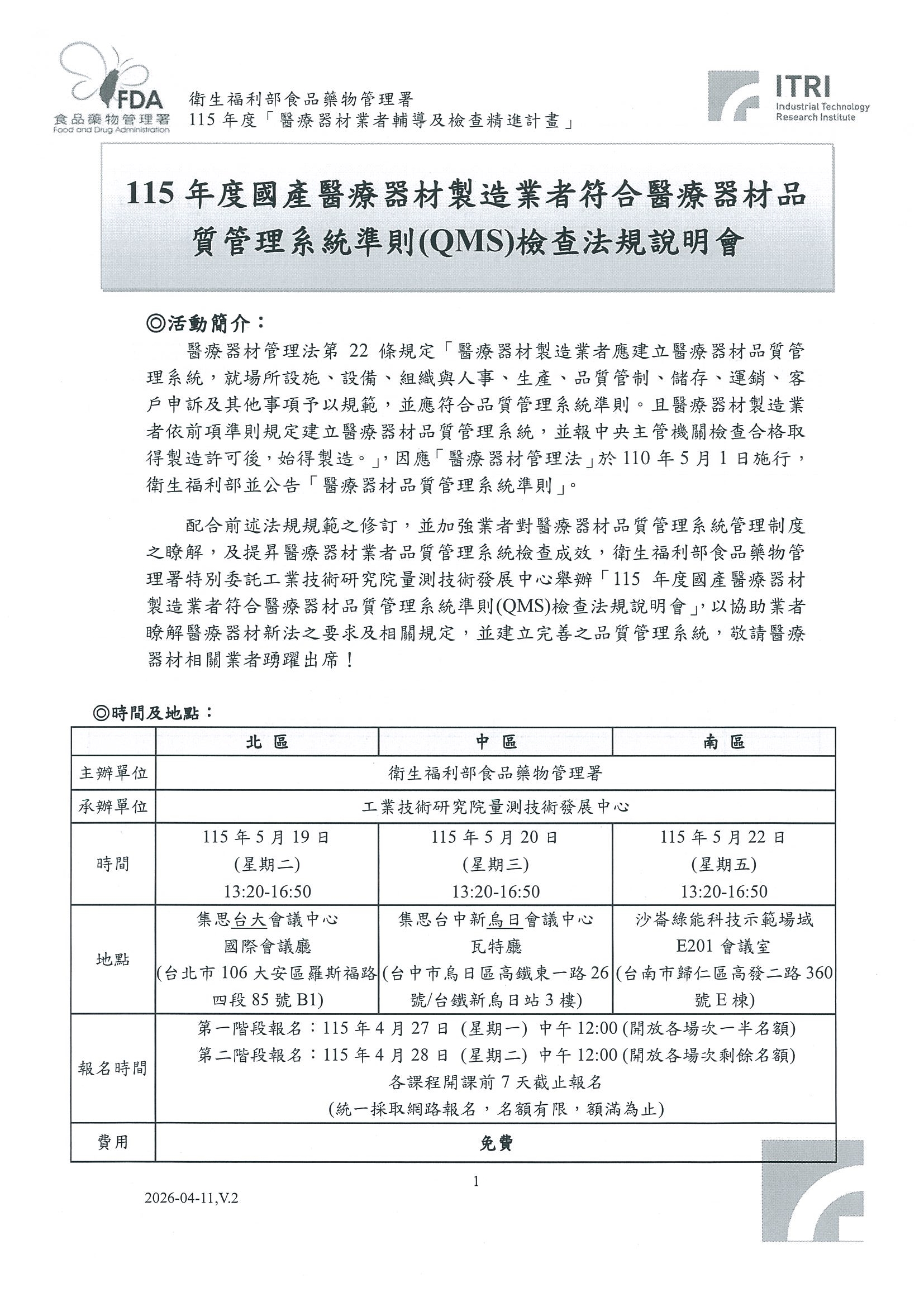 【工研院】敬邀參加「115年度國產醫療器材製造業符合醫療器材品質管理系統準則(QMS)檢查法規說明會」
