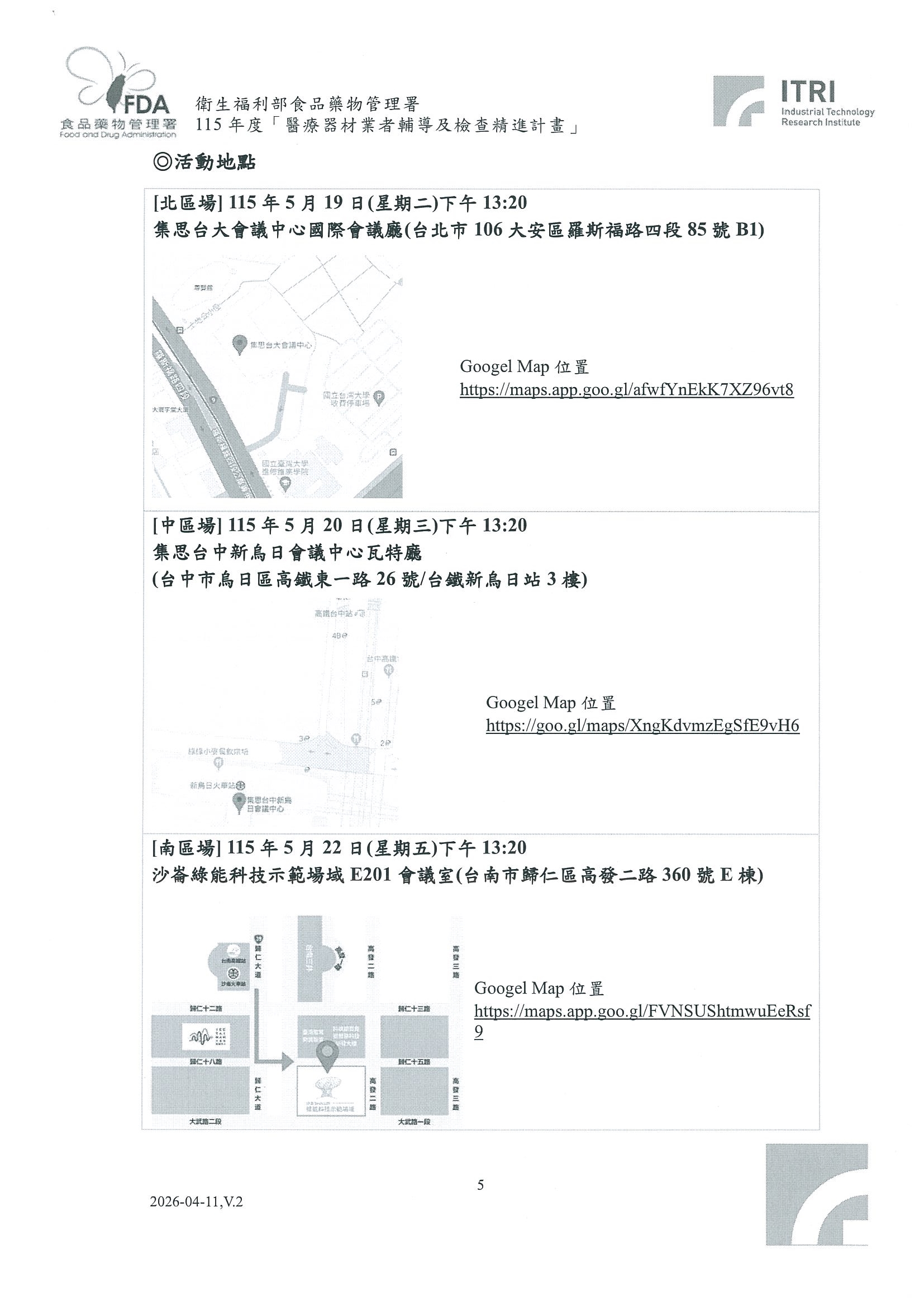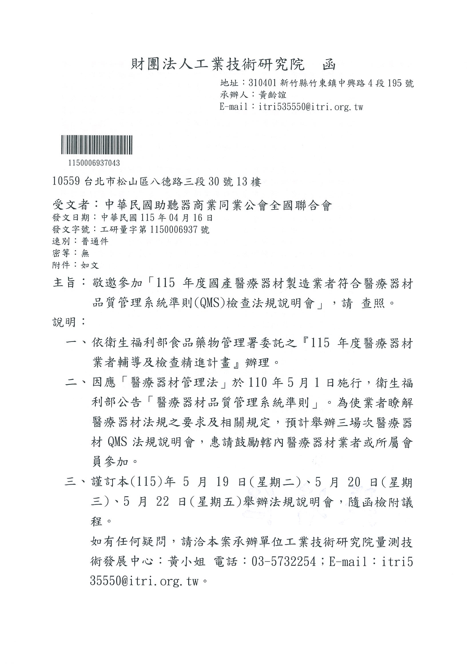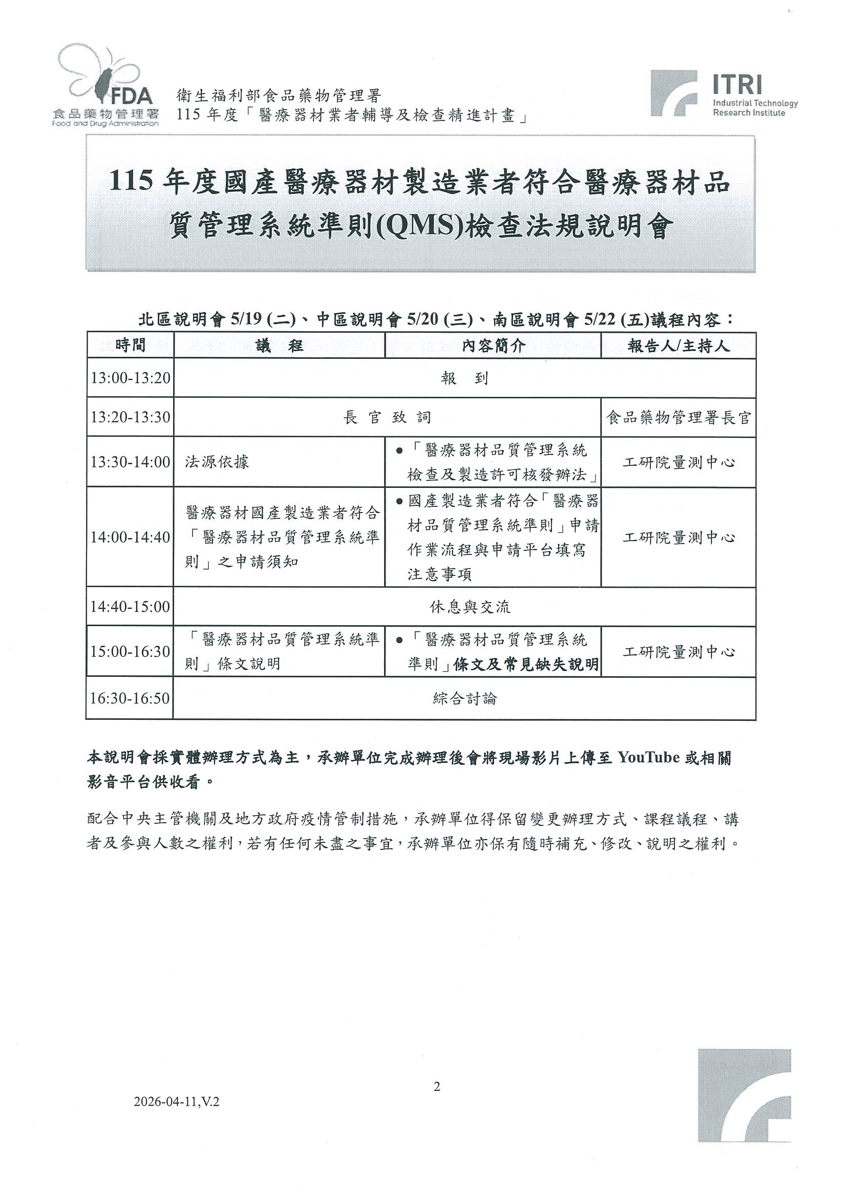 【工研院】敬邀參加「115年度國產醫療器材製造業符合醫療器材品質管理系統準則(QMS)檢查法規說明會」