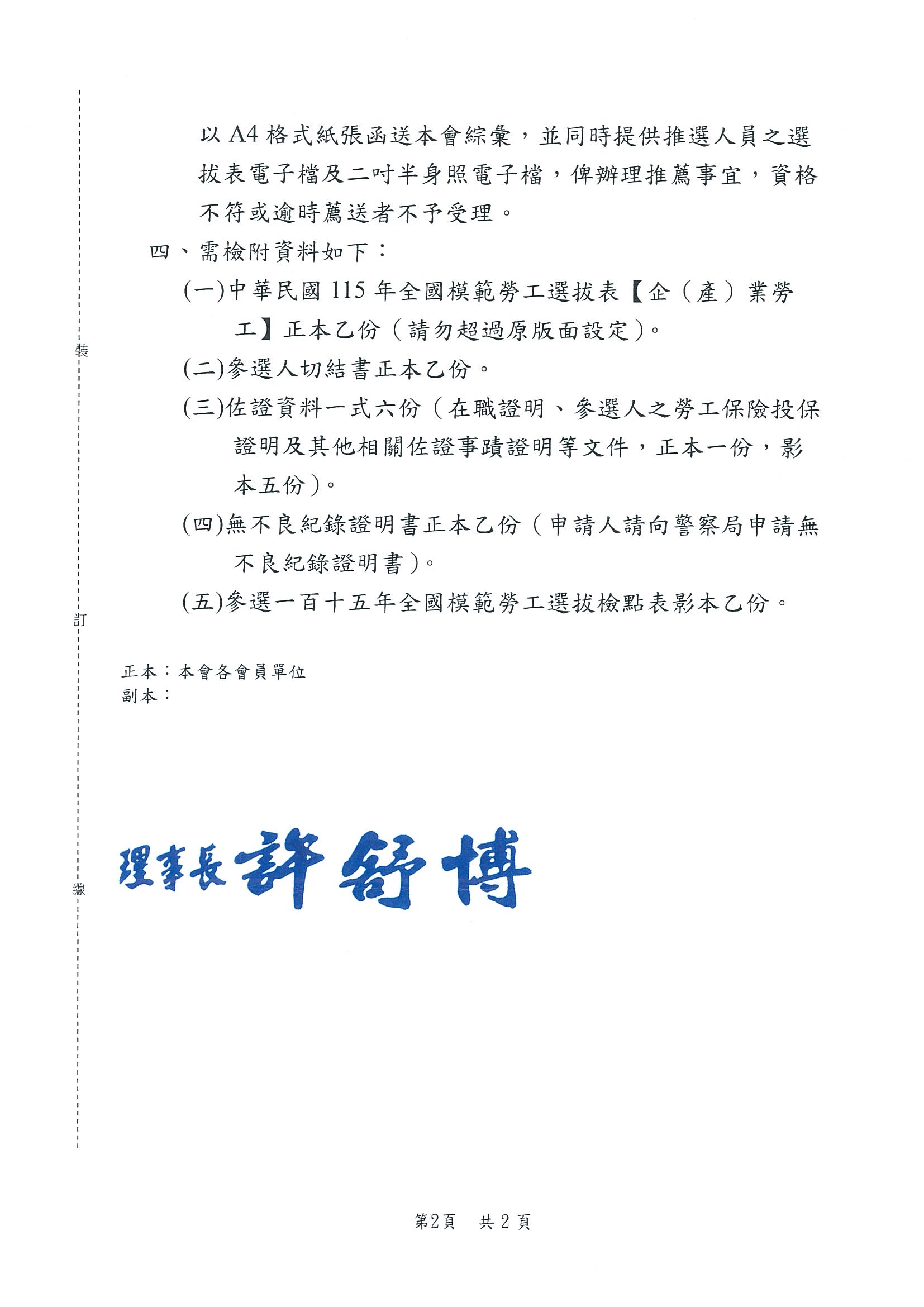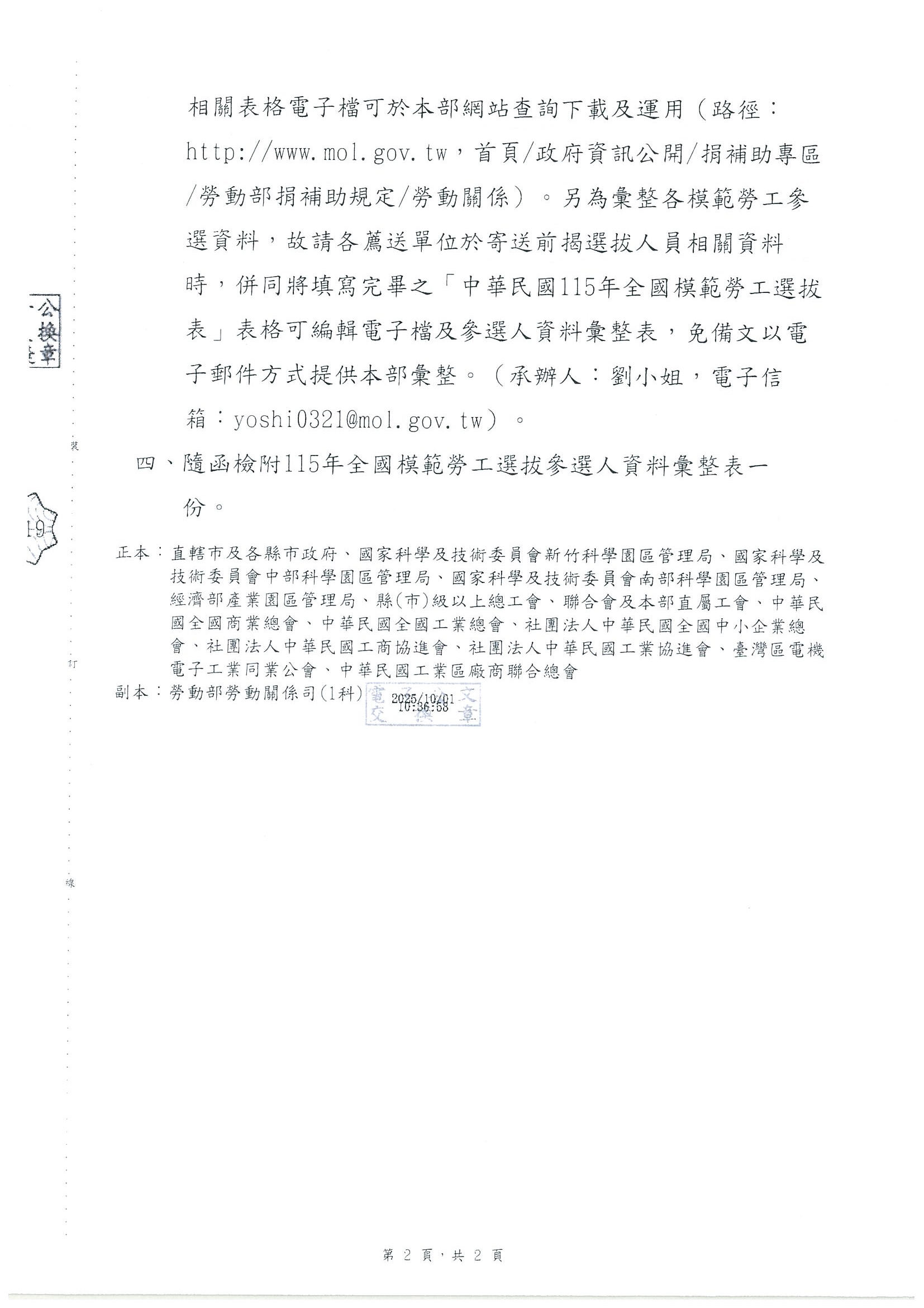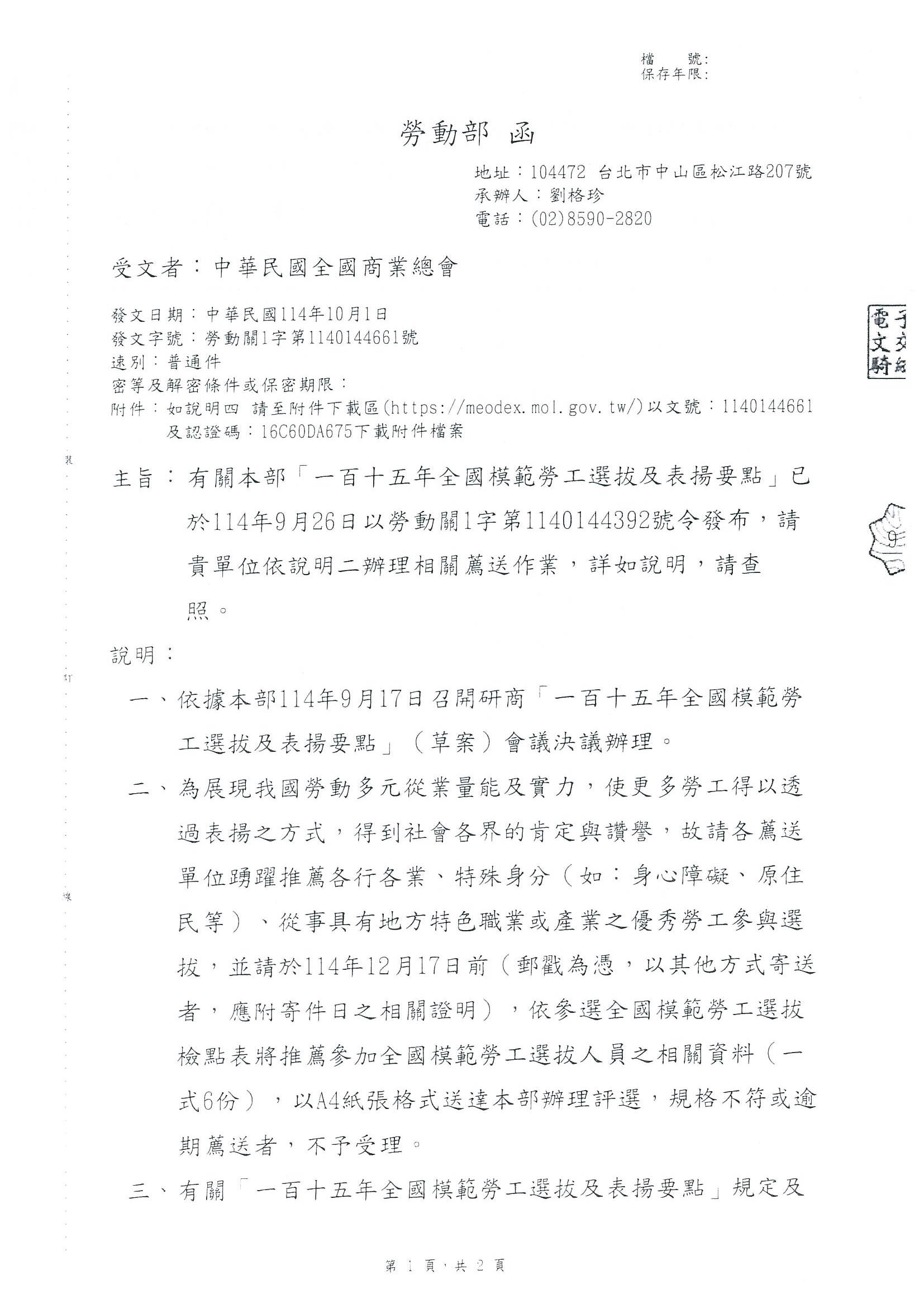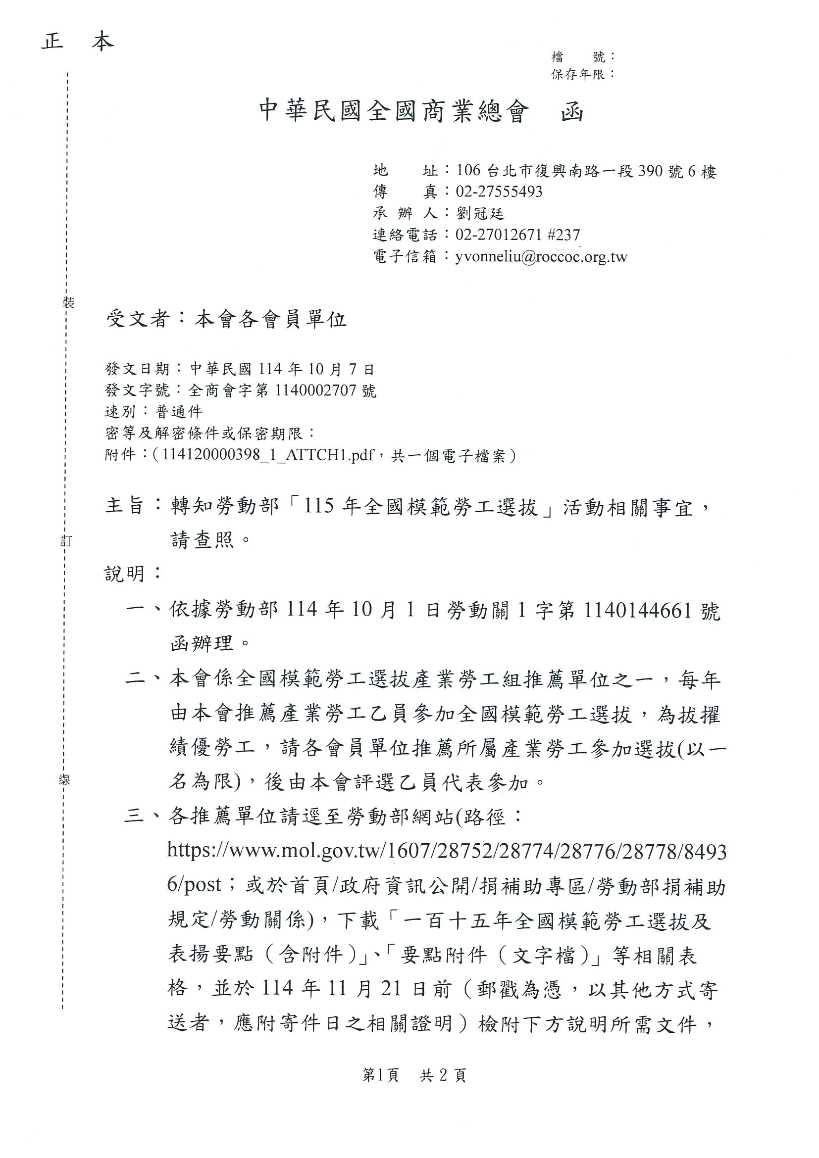 【全國商總】勞動部「115年全國模範勞工選拔」活動相關事宜