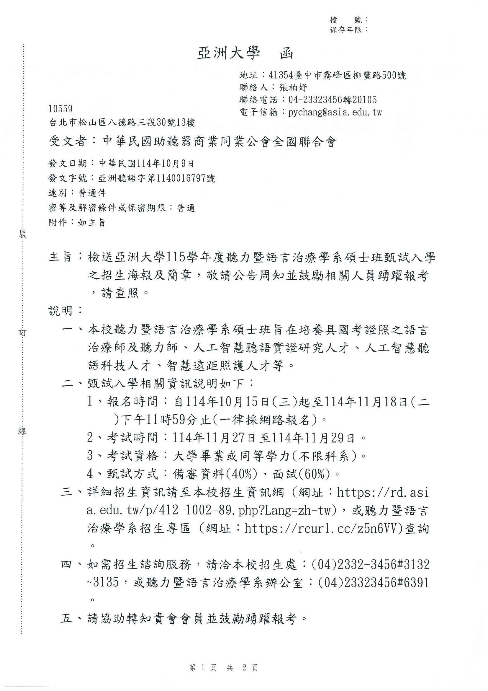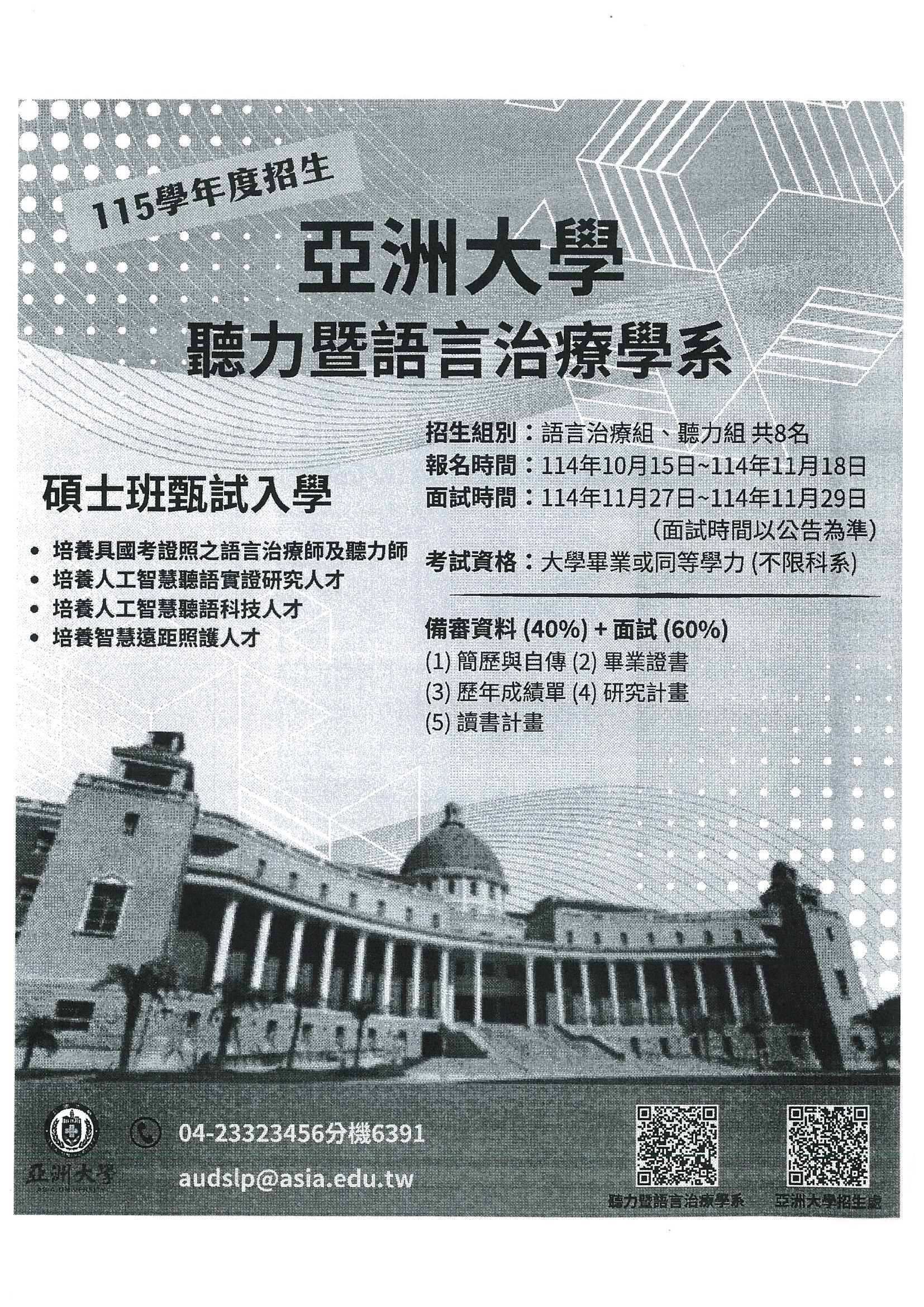 【亞洲大學】115學年度聽力暨語言治療學系碩士班甄試入學簡章